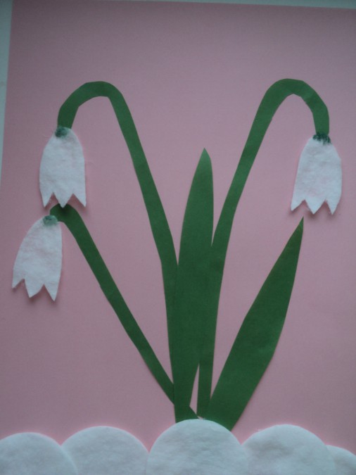 •И наконец, из ватных дисков вырезаем бутоны подснежников. Внешне они напоминают бутон тюльпанов. Если сами затрудняетесь вырезать такую заготовку, попросите маму, папу или старшего брата, сестру нарисовать их на ватном диске. Вырезанные элементы прикрепите к нашим стебелькам головкой вниз. Красивая аппликация готова.