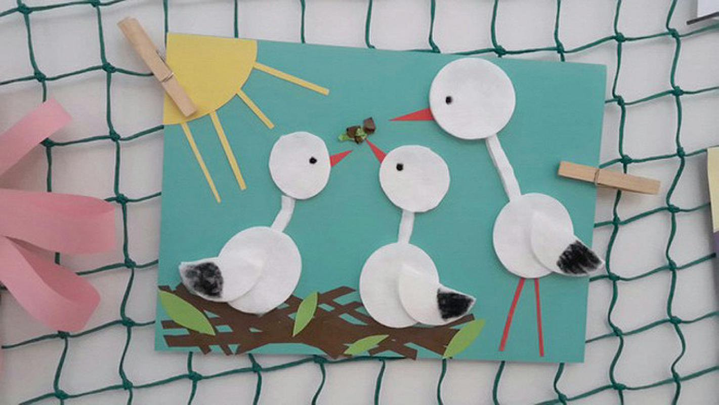 Очень распространены для детей 5-6 лет поделки из ватных дисков ко дню матери. Несколько из них сделаем и мы. Попробуй сделать маму-цаплю с птенцами. Работу выполняем так